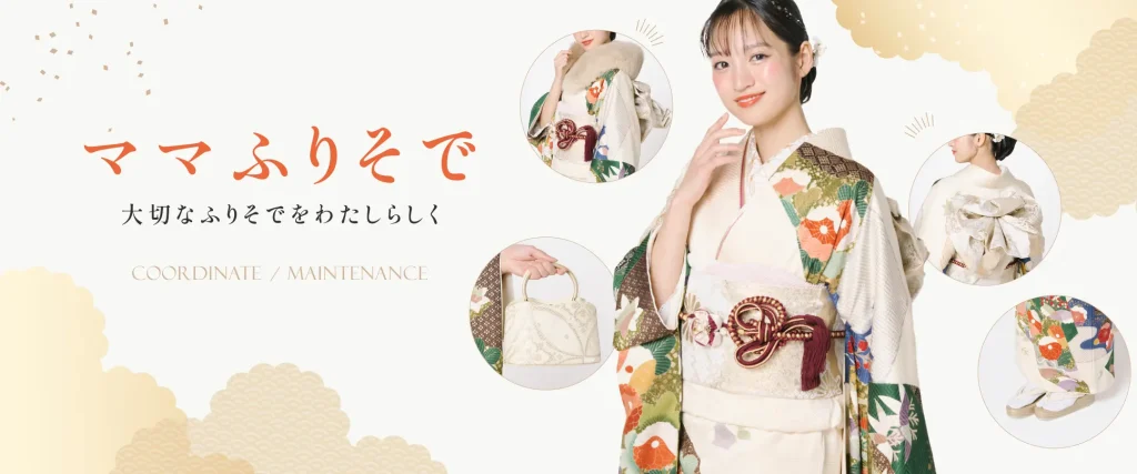 ママ振袖(再利用)プラン¥96,800 〜母親の振袖を活用するプラン。前撮り・小物レンタル・お手入れなどが付く。