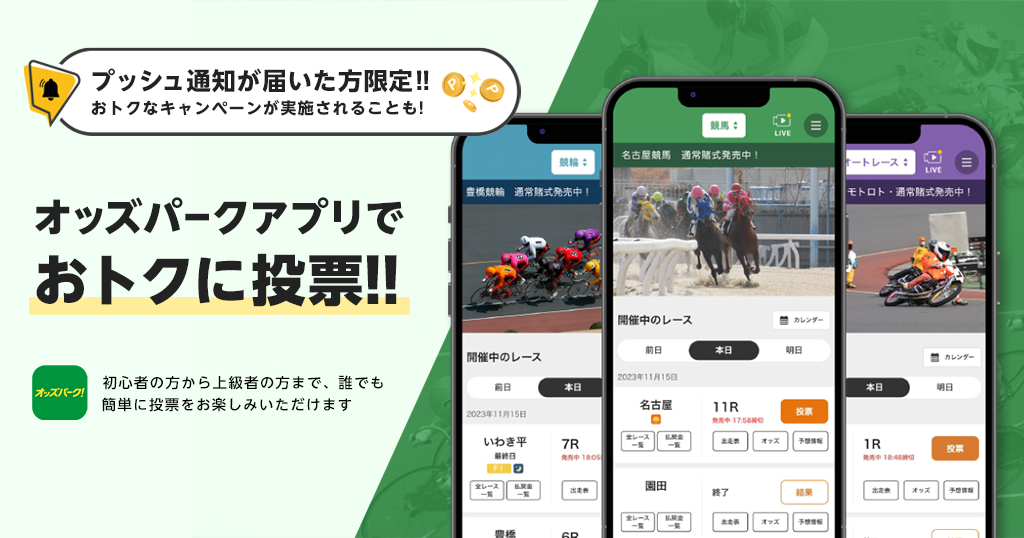 【注意喚起】 公営競技は20歳になってから、適度に楽しみましょう。 車券・舟券・勝馬投票券の購入は、ご自身の判断と責任で行ってください。 ギャンブル依存症にお悩みの方は、専門の相談窓口([団体名・電話番号])へご相談ください。